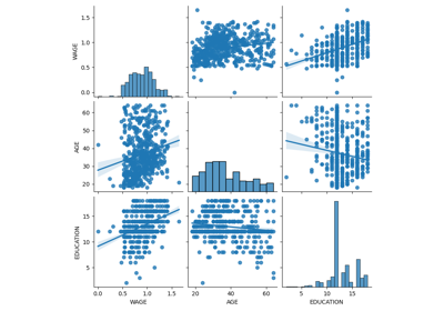 >>> seaborn.pairplot(data, vars=['WAGE', 'AGE', 'EDUCATION'],