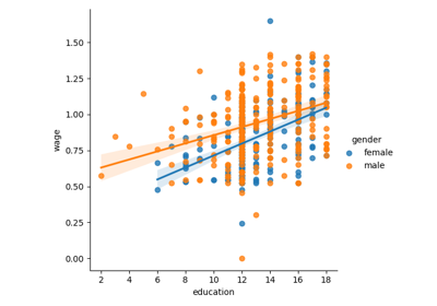 A regression capturing the relation between one variable and another, eg wage and eduction, can be plotted using seaborn.lmplot():